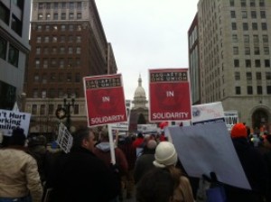 Actors joined the throngs of labor protesters around the Michigan capitol building in Lansing in a vain attempt to dissuade Republican lawmakers from passing two right-to-work bills.